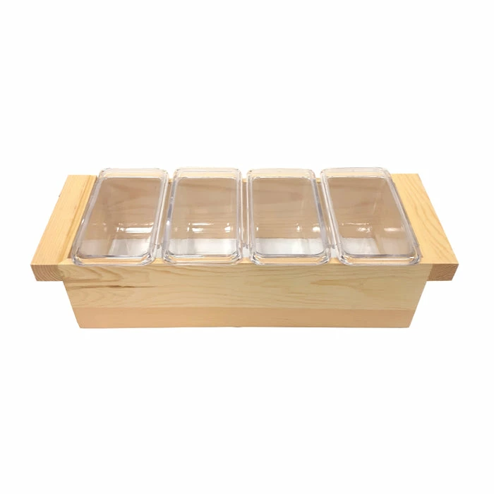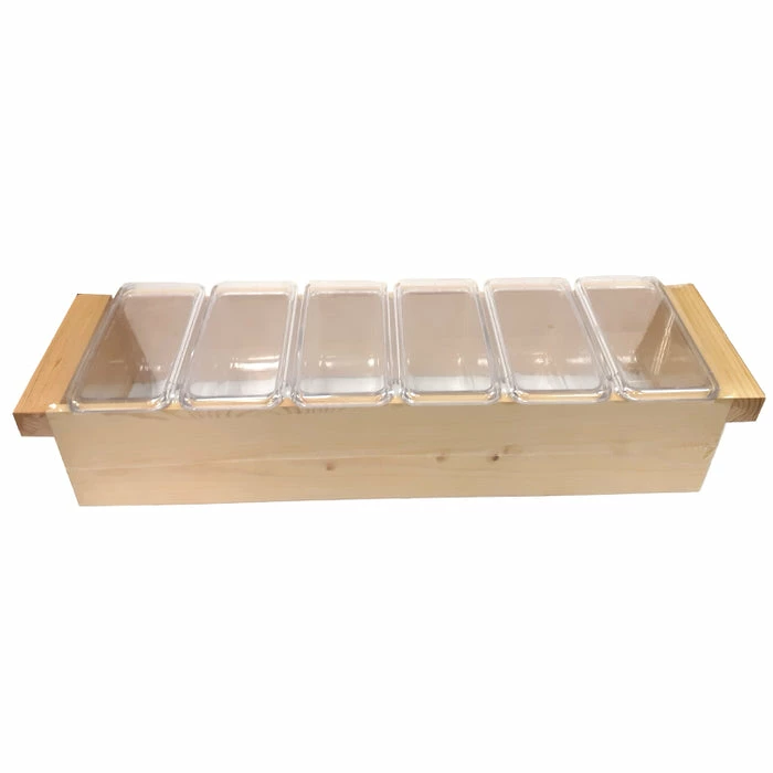 Looking for an economical way to set up your bar? Try these quality BarConic® natural wood condiment holders (a.k.a. fruit trays). These wood condiment holders are perfect for storing all your cocktail garnishes and keeping them fresh. They’re easy to clean with removable transparent pint containers with slide-on lids. Condiment holders like these are a necessary part of any bartending operation. These smaller sizes are great for bars that don’t have the room for the larger sized condiment holders. They come in 4 or 6 pint compartment sizes.
