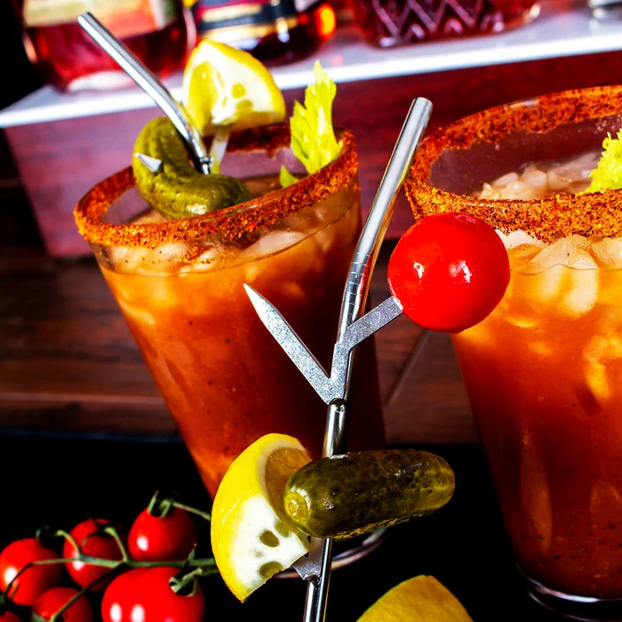 Sip on a cold Bloody Mary and enjoy your garnishes with the neat 2 in 1 straw. This durable stainless steel straw comes equipped with an alternating garnish picks that are attached the the straw. Load it up with a variety of garnishes like pickles, cheese, lemons slices, grape tomato’s and much ore. These straws are reusable and are hand wash recommended.