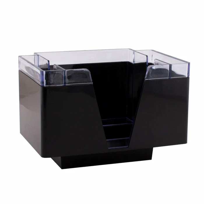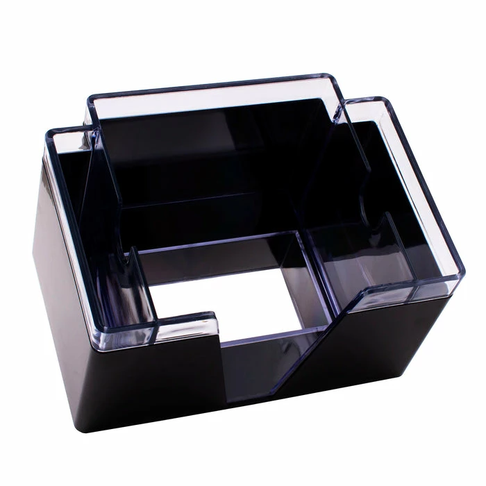 The BarConic® 3 compartment napkin caddy is an economical way to keep your bar tops organized. The foot is designed to fit on a drink rail. The center fits standard bev naps (cocktail napkins) and the side two pockets can accommodate straws, picks, stirrers, and more. This is a standard accessory for any bar. This caddy features a beautiful black outer lining and a clear plastic inside. It is made of hard sturdy plastic and measures 5.75″ L x 7.75″ W x 5.25″H. Napkins and refill products are sold separately.