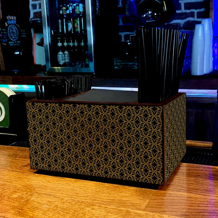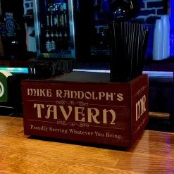 This beautifully rustic wooden Bar Caddy is an exceptional addition to any type of bar setting! The quality craftsmanship (handmade in the USA) is beyond compare. Designed with 3 compartments perfect for storing your bev naps, straws and stirrers. Durably built with a quality imprint dyed right into the wood maintains a desirable (and trendy) rustic wooden appeal.